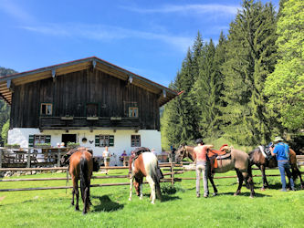 2.Tag: Nach dem Frühstück starten wir unseren Ritt durch das facettenreiche Achental zum Wössner See und genießen flotte Galoppaden über pflanzenreiche Bergwiesen. Auf dem Weg kreuzen wir den Fluss Tiroler Ache, der in den Chiemsee mündet und durchqueren ihn je nach Wasserstand und Witterung. Immer wieder laden ebene Trab- und Galoppstrecken zu höherem Tempo ein. Zum Mittag kehren wir an einem herrlichen Bergsee ein und haben bei schönem Wetter die Möglichkeit, baden zu gehen. Anschließend reiten wir an zahlreichen kleinen Wasserfällen vorbei, die uns in Richtung eines Trailweges führen. Entlang des am Weg gelegenen Baches reiten wir einen Berg hinauf zur familiengeführten Kaspressknödelalm, die bekannt für ihre leckeren Knödel ist, die wir unter anderem gemeinsam beim Abendessen genießen können. Übernachtung auf der Alm. 3.Tag: Im Anschluss zum schmackhaften Frühstück reiten wir durch die Chiemgauer Bergwelt auf teils gleicher Route wieder zurück und genießen die wunderschönen Ausblicke! Zur Stärkung kehren wir auf einer Alm oder am Wössner See ein und lassen gemeinsam das abwechslungsreiche Wochenende Revue passieren lassen. 2 Reittage je 5-6 Std. |
